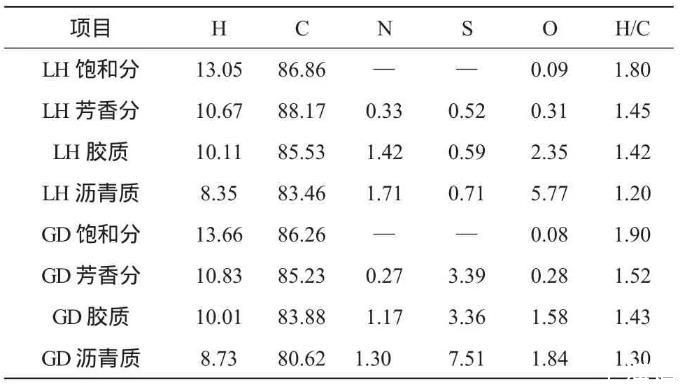 辽河和孤岛两种稠油组分的平均相对分子质量和元素分析结果见表3、4。