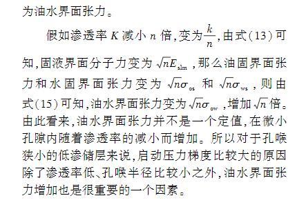 假如渗透率K减小n倍,变为kn,由式(13)可知,固液界面分子力变为nEslm,那么油固界面张力和水固界面张力变为nσos和nσws,则由