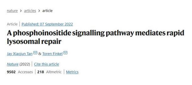 9月7日,来自匹兹堡大学医学院细胞生物学系的谭小军博士与衰老研究所所长Toren Finkel博士在《自然》(Nature)杂志发表了一篇题为“A phosphoinositide signalling pathway mediates rapid lysosomal repair”的细胞生物学领域研究论文。研究者们通过一系列实验,首次描述了一种溶酶体修复的核心途径:PITT途径(phosphoinositide-initiated membrane tethering and lipid transport)。通过该途径,细胞能快速修复已受损的溶酶体。该发现将协助人们进一步了解和治疗由溶酶体受损驱动的与年龄相关的疾病。
